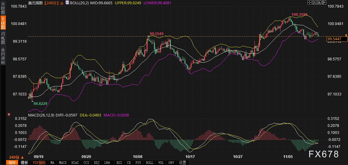技术层面,美债、美元和黄金的240分钟图表显示出关门尾声的印记,基本面驱动正逐步嵌入价格路径。10年期美债收益率当前报4.116%,日内小幅回落,但布林带(BB 20,2)中轨位于4.109%,上轨4.146%、下轨4.072%,显示价格在中上轨区间震荡,MACD(26,12,9)DIFF为0.005、DEA为0.006,正值虽窄小,却暗示动能偏向上行。这反映了重开预期下的风险偏好修复:关门期间收益率曾因流动性担忧而下探下轨,重开信号已推动其回测中轨,融合了财政支出重启的供给压力。技术派观点认为,此区间内,美债收益率的突破将直接锚定美元路径——上轨失守或确认再通胀定价,下轨则暴露数据疲软风险。