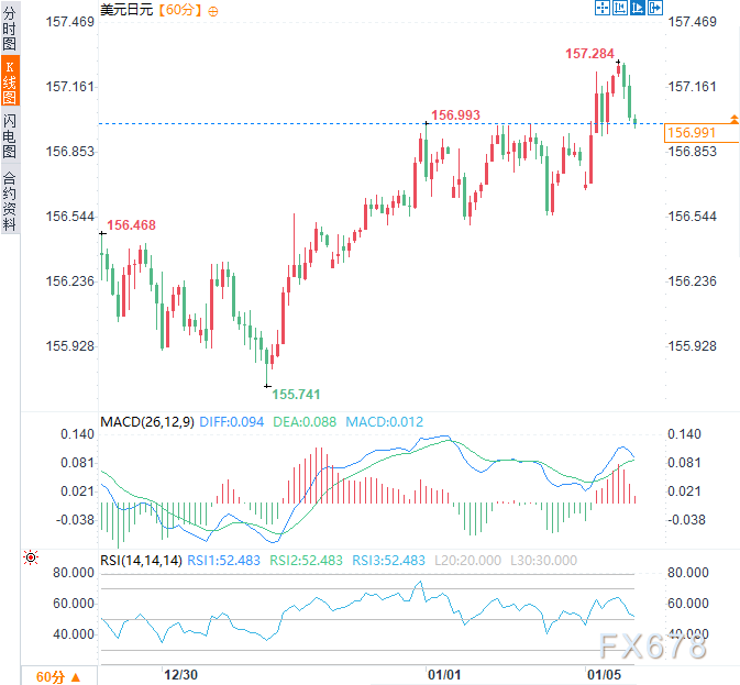 周一亚欧时段,美元兑日元上涨约0.13%,现交投于157.00附近,此前曾触及157.28,为2025年12月23日以来首次。